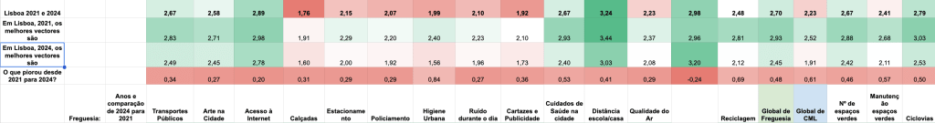Neste inquérito especialmente interessante é a comparação entre os dados de 2021 com os recolhidos em 2024. Algumas métricas perderam interesse (como, p.ex., a que respondia a resposta da autarquia (Junta ou CML) à COVID. Já a métrica que se refere ao acesso à Internet perdeu também interesse já que, em Lisboa, existe hoje acesso à banda larga em toda a cidade. Por essa razão, em 2025, essas duas métricas não foram submetidas a análise embora no mapa online estejam disponíveis esses dados a quem os quiser consultar.