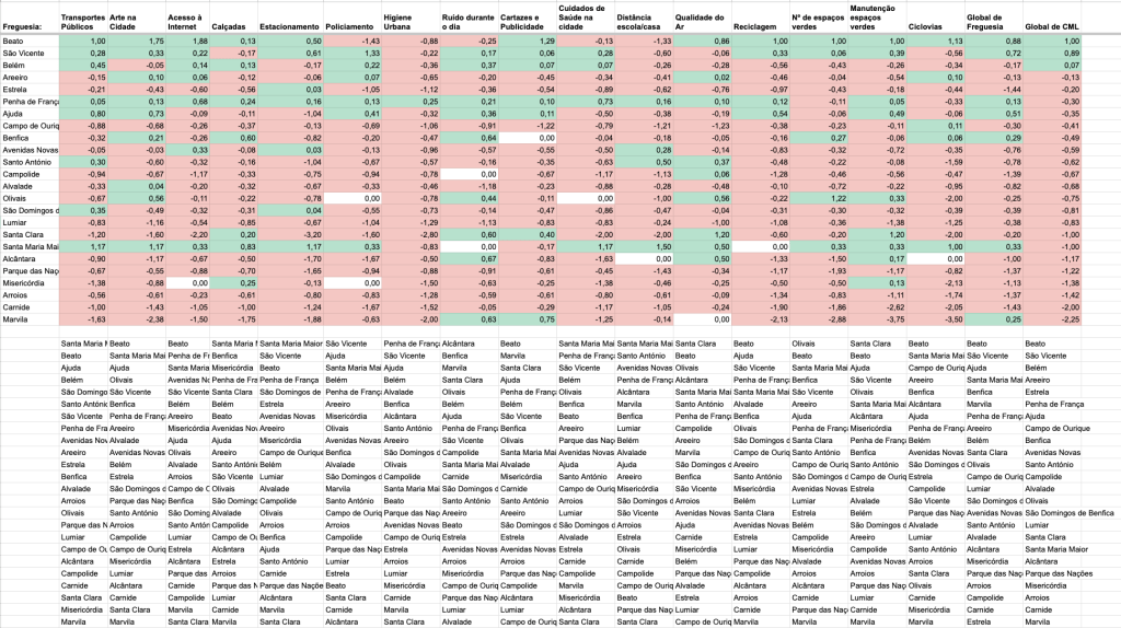 Em 2021 e excluindo freguesias com poucas respostas, tínhamos Alcântara, Lumiar e Santo António com as melhores classificações e Misericórdia, Ajuda e São Vicente com as piores.