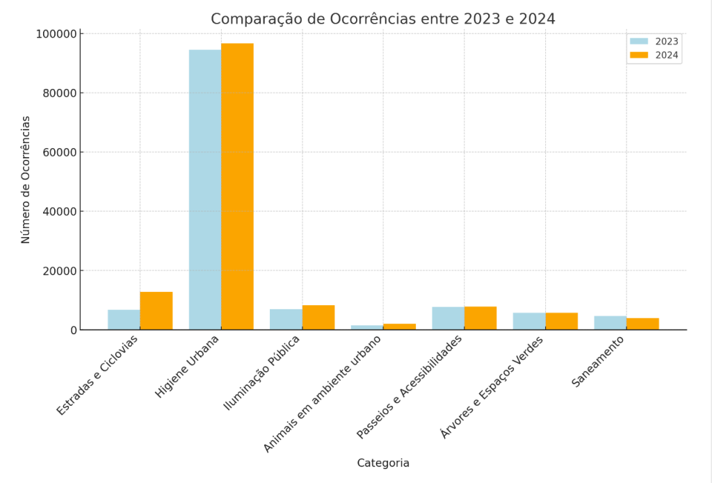 Limpeza (papeleiras, embalagens, …) | 2023: 1 | 2024: 3 | Diferença: 2 | Crescimento: 200.00%