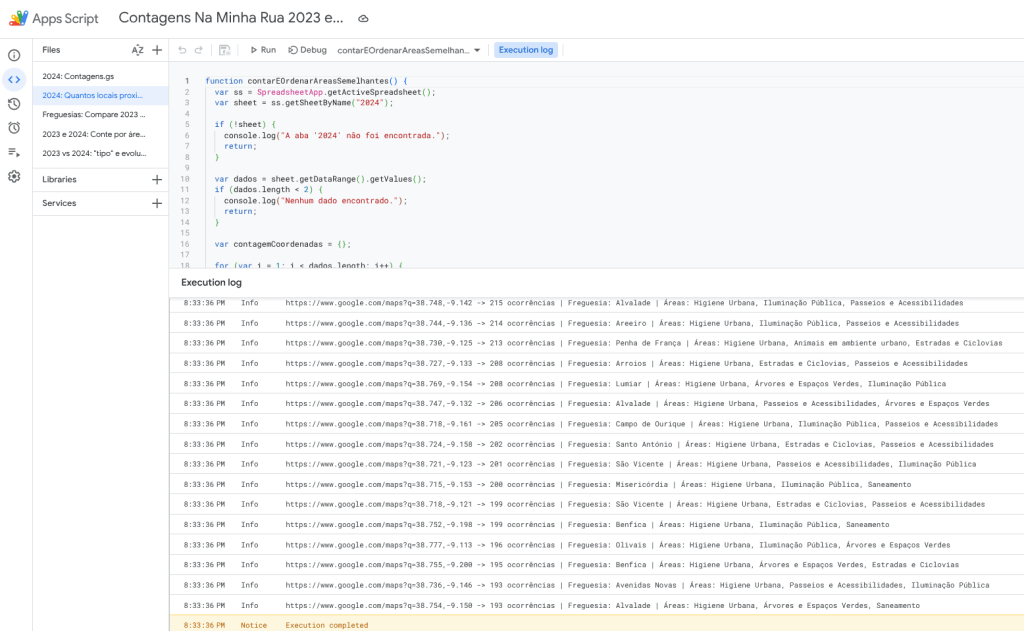 Contagem de ocorrências por mês e área em 2024 em toda a cidade de Lisboa: