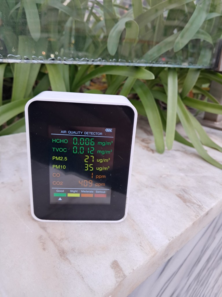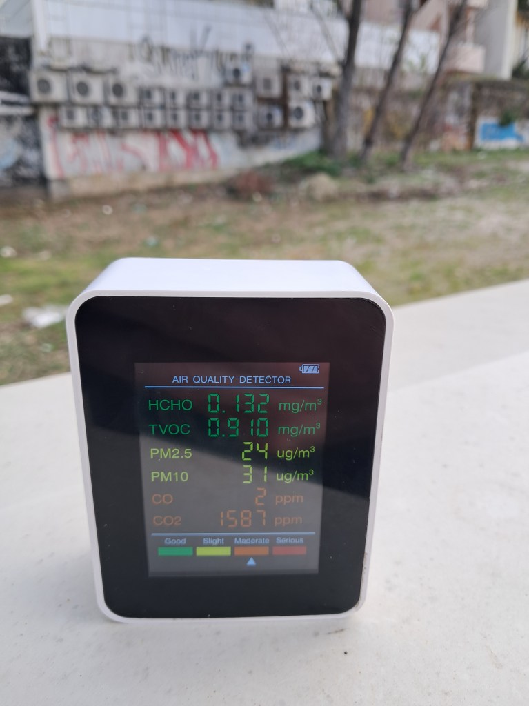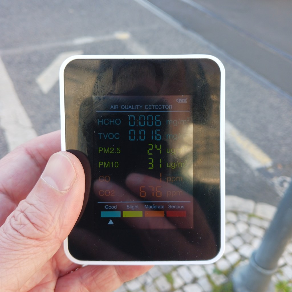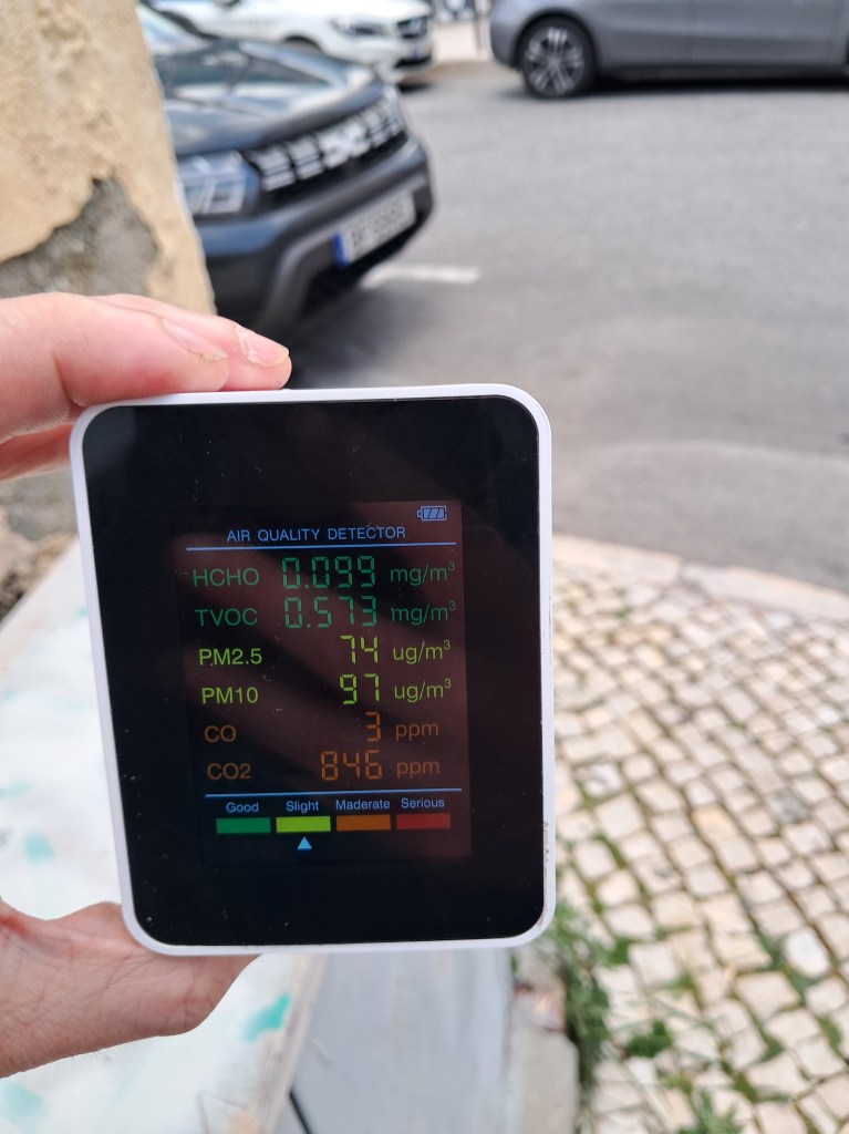 - Um carro com janelas abertas ainda regista valores altos em HCHO mg/m3 e TVOC mg/m3. Com janelas fechadas regista também altos valores de CO2 e CO que descem quando são abertas