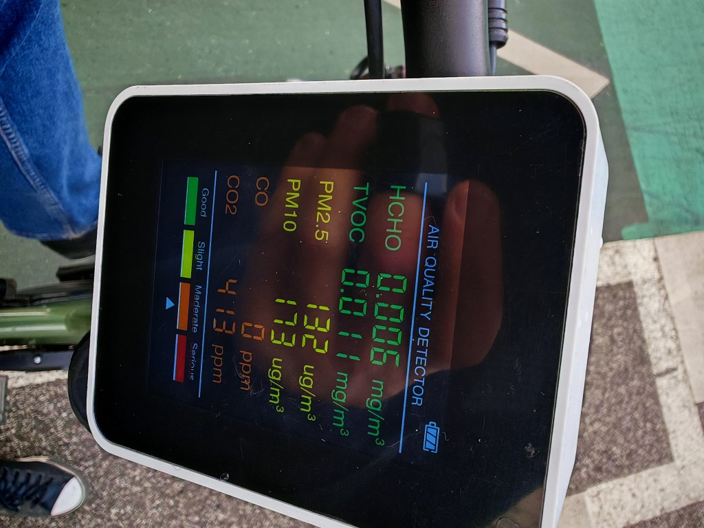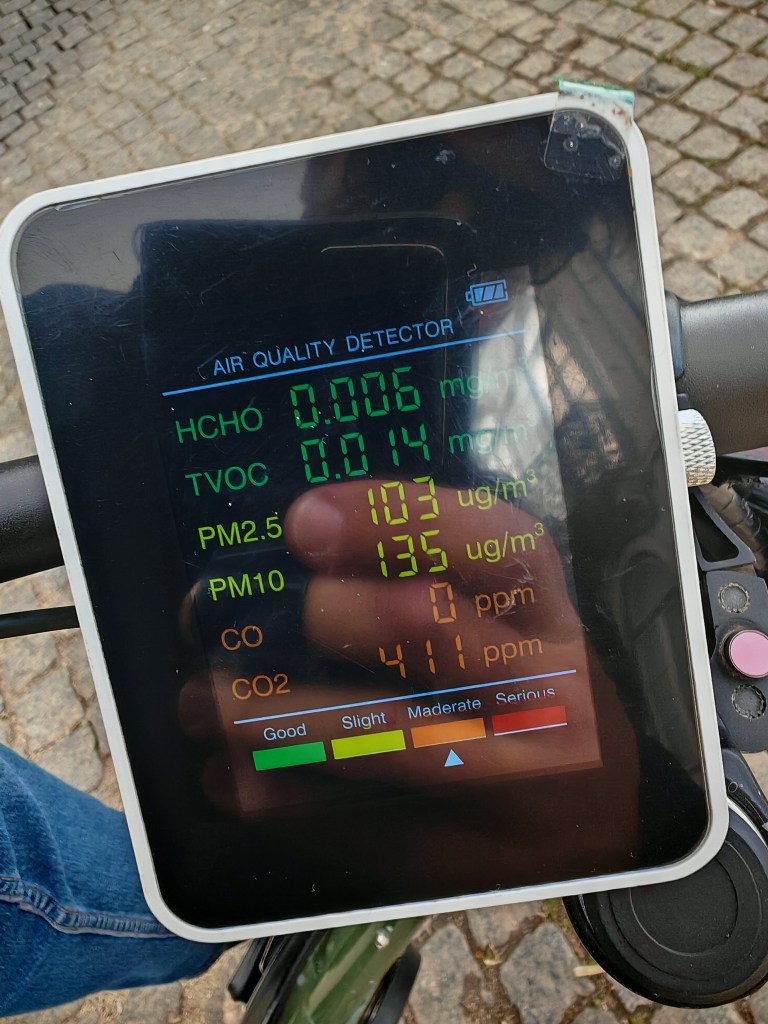 - As rodas da bicicleta e a própria deslocação criam turbulência no ar, que levanta partículas do chão (poeiras, partículas de pneus, travões, etc.), o que pode inflacionar as leituras.