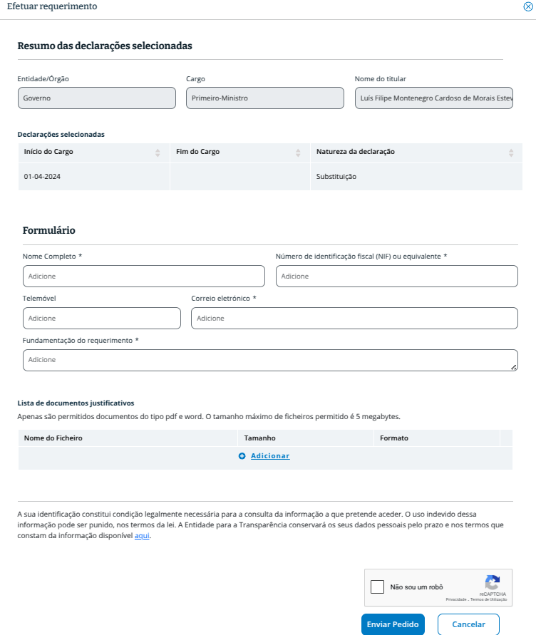 Através do seu sítio oficial, a referida entidade exige, como condição para consultar o Registo de Interesses, o fornecimento obrigatório dos seguintes dados pessoais: